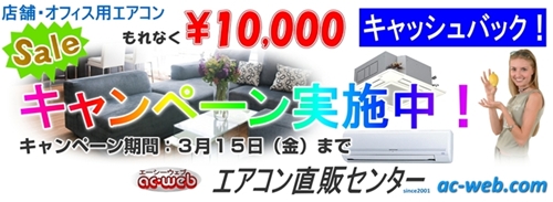 業務用エアコン激安通販のエアコン直販センターでは表記のとおりキャッシュバックキャンペーンを実施中です!